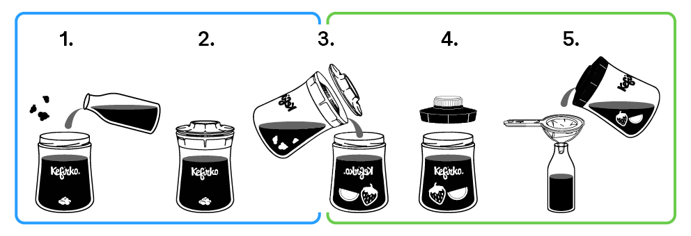 - Produces the basic food or beverage (milk kefir, kombucha, water kefir).