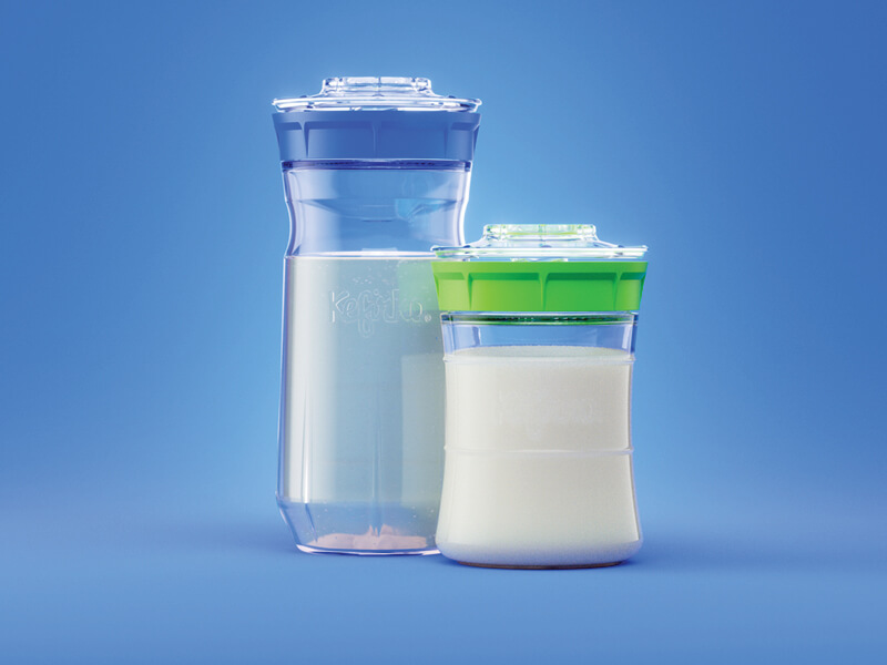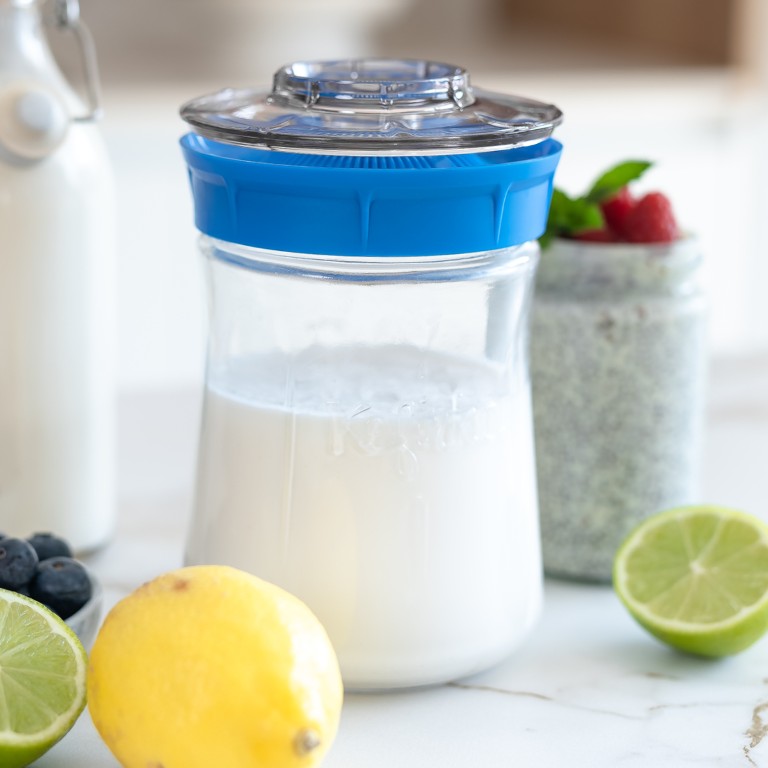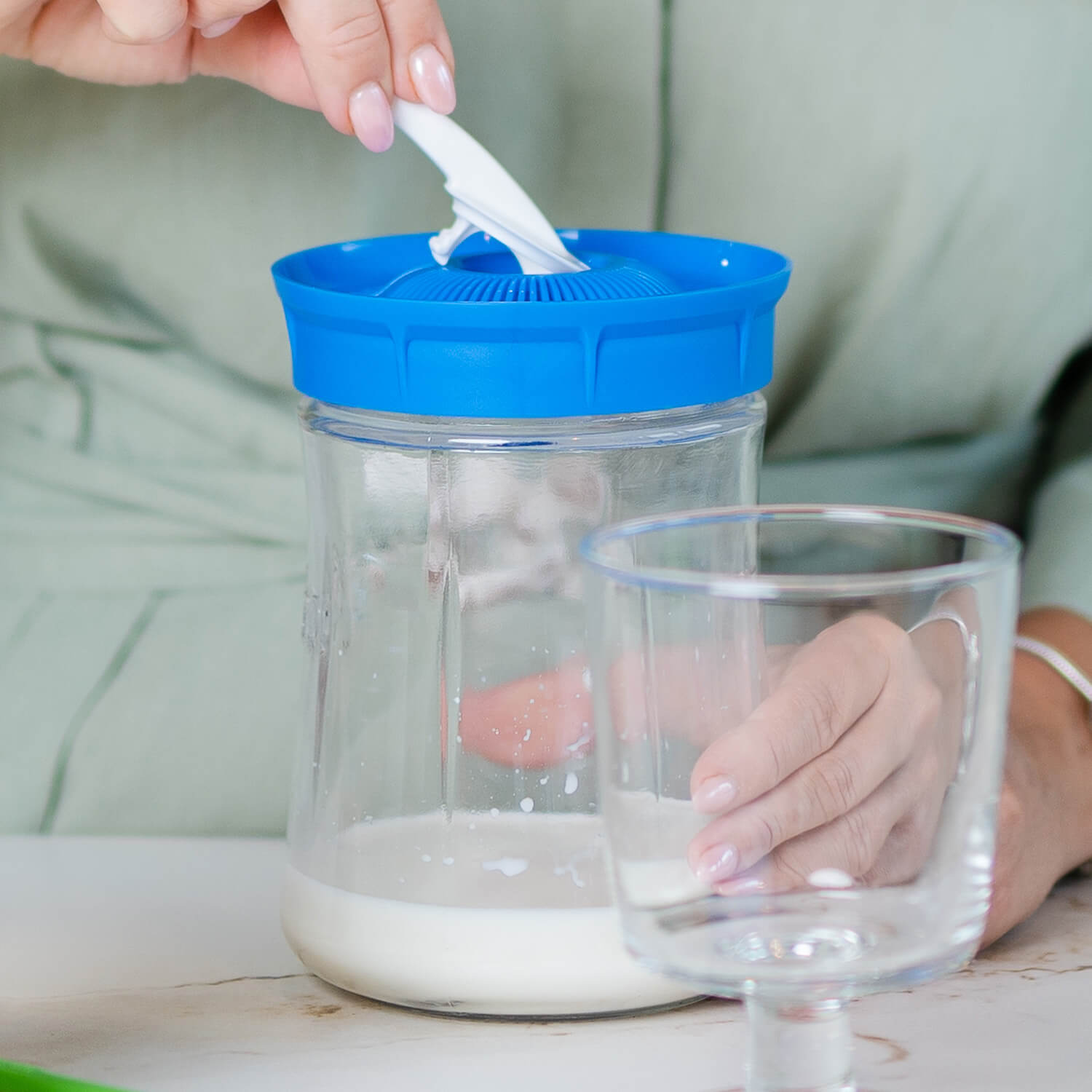The proper ratio between the grains and milk is important, when making milk kefir. Kefirko Kefir Maker is equipped with a measuring cup in the top lid and tactile markings on the outside of the jar. Measure the grains first: for one serving fill the measuring cup with the grains up to the first mark for one serving, or up to the top (approx. 6 g) for two servings or full Kefirko Kefir Maker.