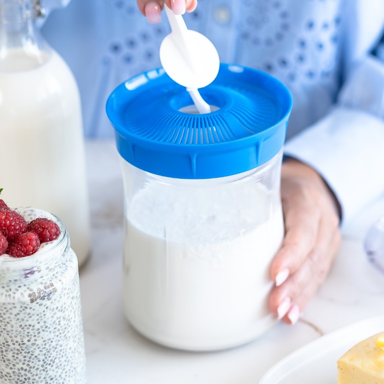 When kefir ferments, remove the strainer lid and stir the kefir until creamy consistency. Screw the strainer back on the jar.